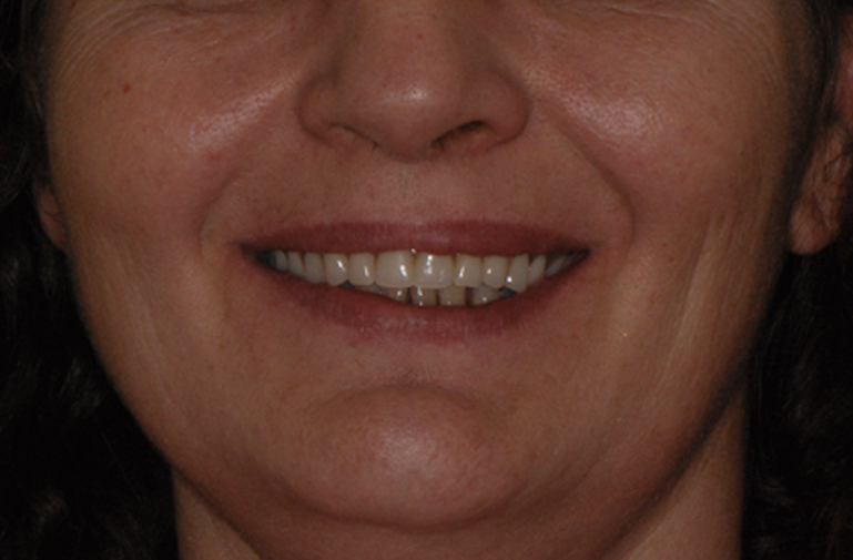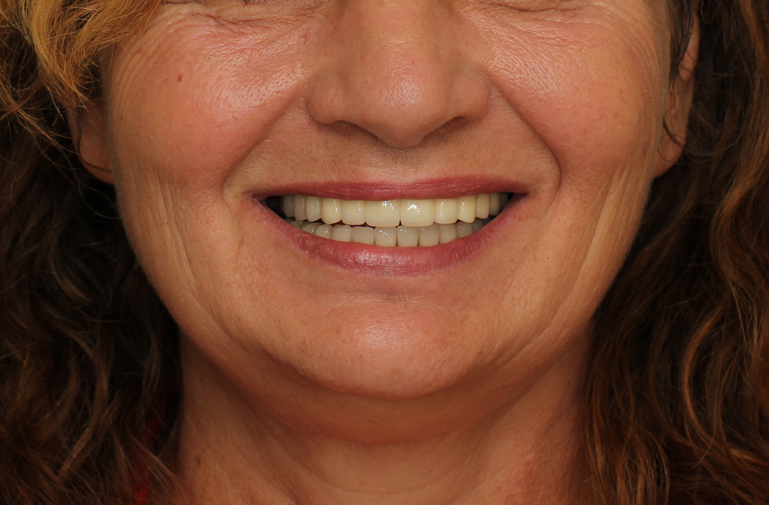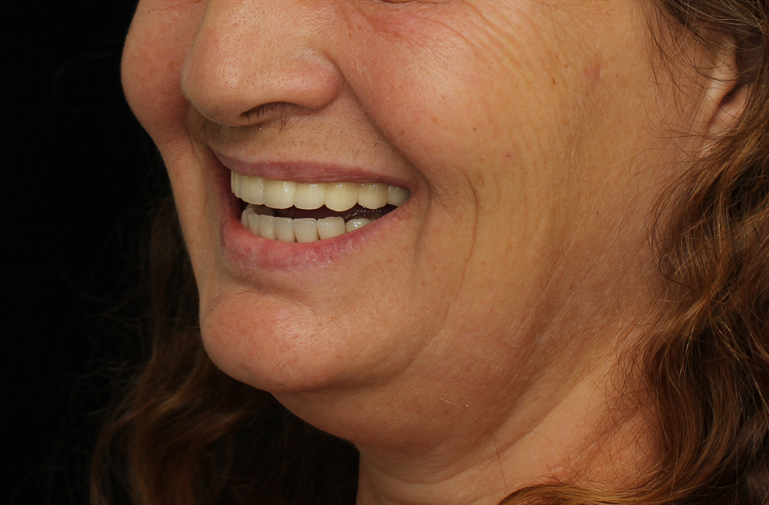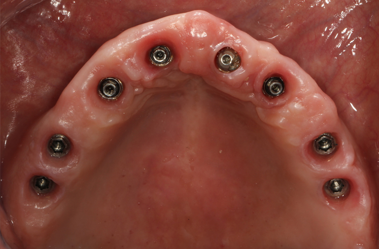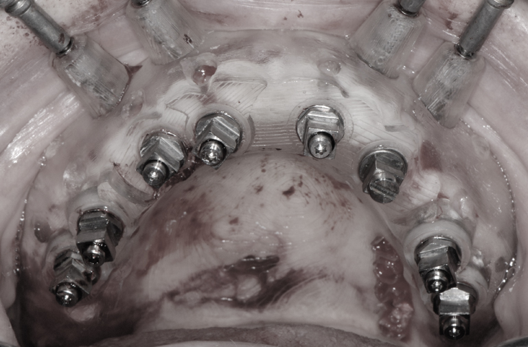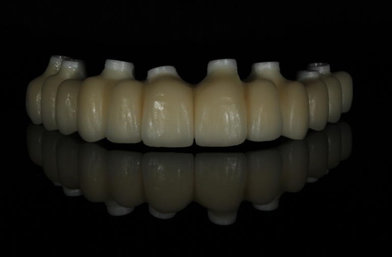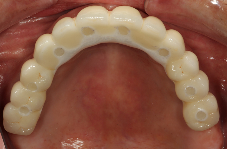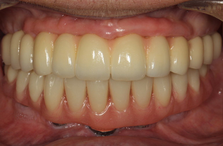 New dentures were fabricated to serve as radiographic guides. Using a modification of the guided surgery technique, eight maxillary implants and five mandibular implants were placed and immediately supported to provisional fixed prostheses. Following an osseointegration period of six months in the maxilla and four months in the mandible, osseointegration was confirmed. In accordance with the limited inter-arch space as well as esthetic requirements, it was elected to fabricate a one-piece full arch porcelain veneered zirconia framework and oppose this with a resin-veneered milled one-piece full arch titanium framework.