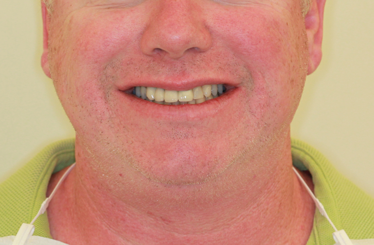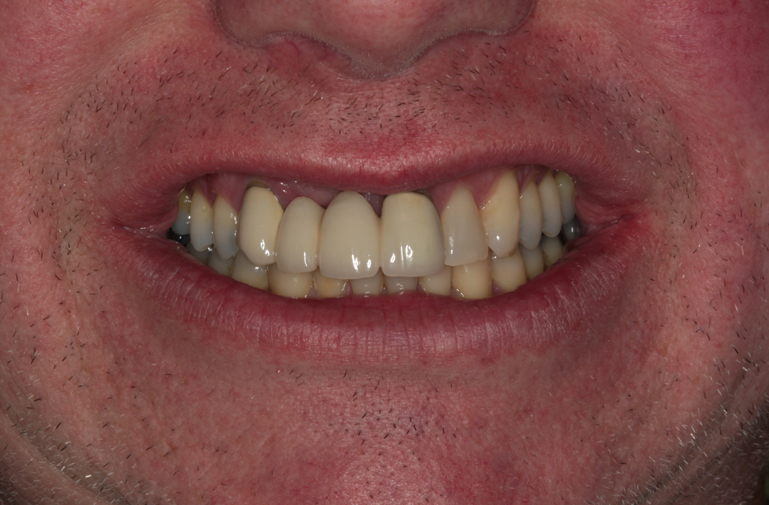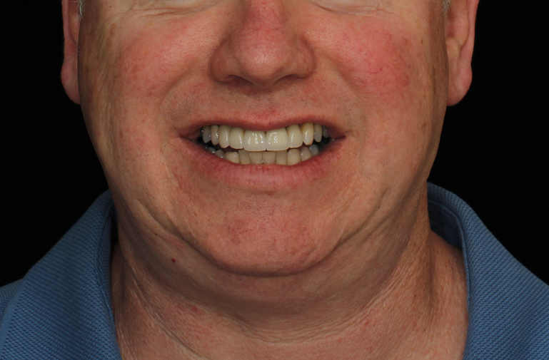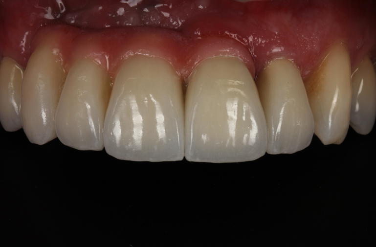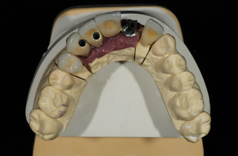 Non-restorable teeth were extracted and implants placed by an oral surgeon using a surgical stent. Treatment was initiated with the understanding that pink porcelain would be necessary for proper esthetics due to the severe horizontal and vertical defect in the region. Despite the severe defect, we were able to achieve an excellent esthetic result with the use of pink porcelain. To manage a facially exiting implant access, a separate crown was fabricated for crown #9 that was cemented onto the prosthesis after it was torqued in to place.